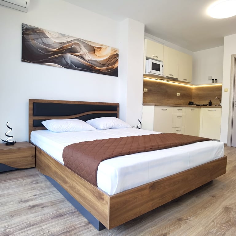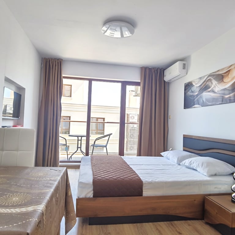 Уютно студио с тераса и морска гледка, разположено на 50м от плаж Кабакум. Подходящо за двойки или самостоятелни гости, които търсят спокойствие, комфорт и удобна локация край морето.